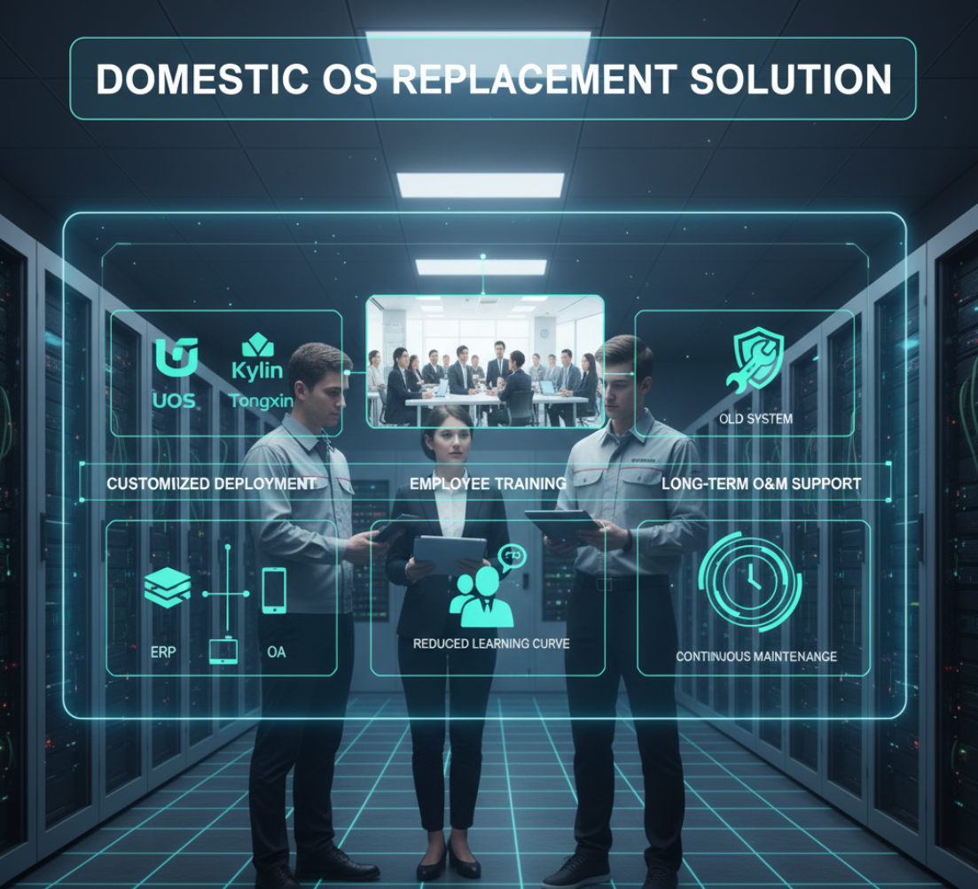 基于企业需求定制统信/UOS/麒麟部署方案,适配OA、ERP等核心业务系统。提供员工操作培训+长期运维支持,降低切换学习成本