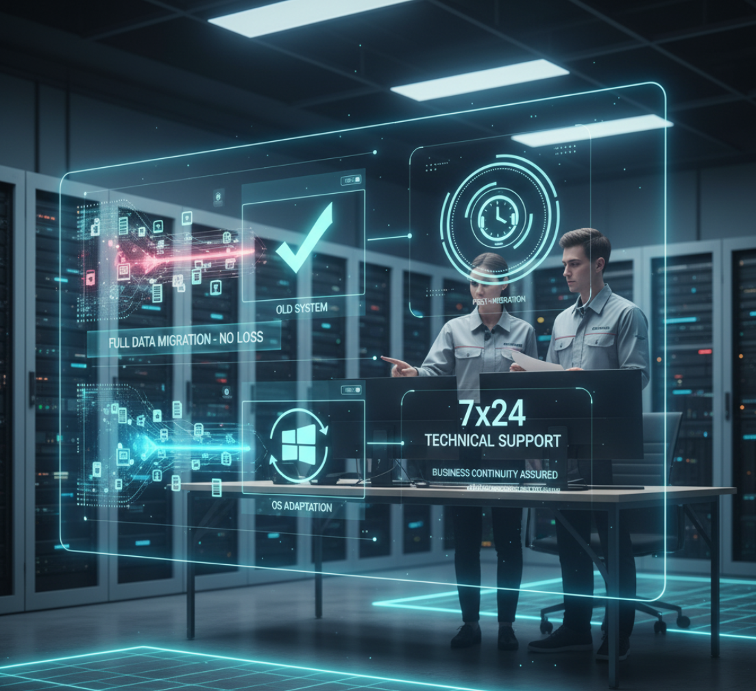 全量数据无损迁移(文件、配置、权限),支持跨系统(如Windows→国产系统)应用适配。迁移后7×24小时技术护航,保障业务无缝衔接