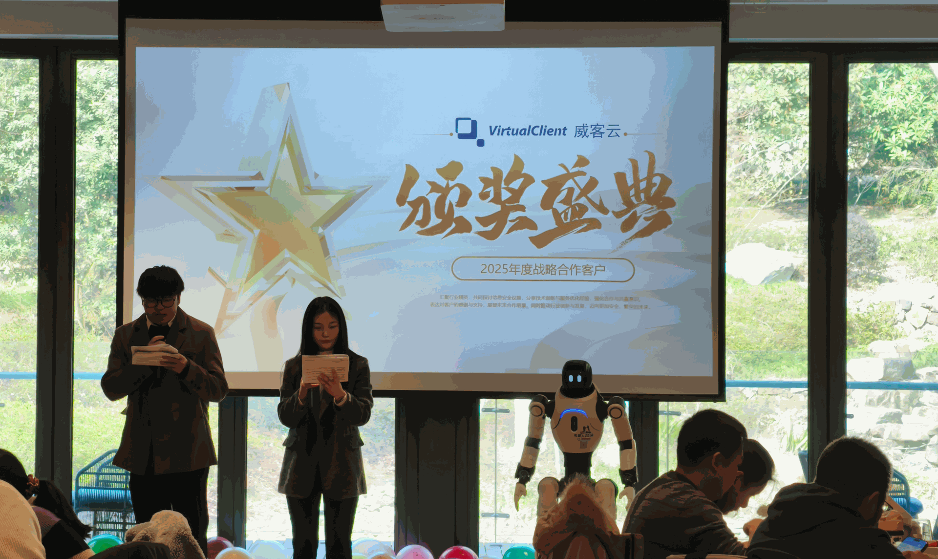 与此同时,机器人“小威”化身贴心向导,在会场间轻盈穿梭,指引宾客有序签到。从精准交互到稳健运行,威客云以硬核的一体化运维实力,让每一场科技对话都从容不迫,尽显智能之美。